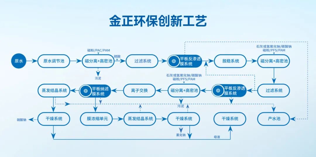 金正環(huán)保煤礦礦井水零排放及資源化利用解決方案,以更短、更高效的流程實現(xiàn)礦井水深度處理及資源化利用,為煤礦及煤化工企業(yè)提供運行成本低、固廢產(chǎn)出量少、膜系統(tǒng)運行穩(wěn)定的創(chuàng)新工藝。該工藝分為四個工藝段,依次是預(yù)濃縮工藝段、脫穩(wěn)濃縮工藝段、深度濃縮工藝段、蒸發(fā)結(jié)晶工藝段。各工藝段可根據(jù)來水水量、水質(zhì)進(jìn)行不同的裝備和工藝組合,實現(xiàn)模塊化、標(biāo)準(zhǔn)化運行,有效解決傳統(tǒng)卷式膜元件易污堵問題,實現(xiàn)高倍濃縮和分鹽,減少蒸發(fā)量,大大降低蒸發(fā)投資及運行成本,保證系統(tǒng)整體穩(wěn)定運行。相比傳統(tǒng)工藝,藥劑用量減少≥80%,軟化污泥產(chǎn)量減少≥60%,去除鈣離子≥70%,成本降低≥60%。